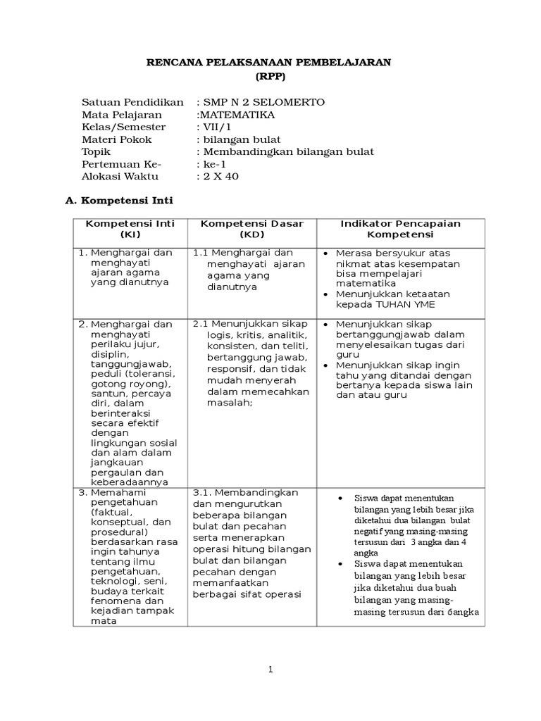 Rpp Bilangan Smp Kelas Vii Tujuh Semester 1