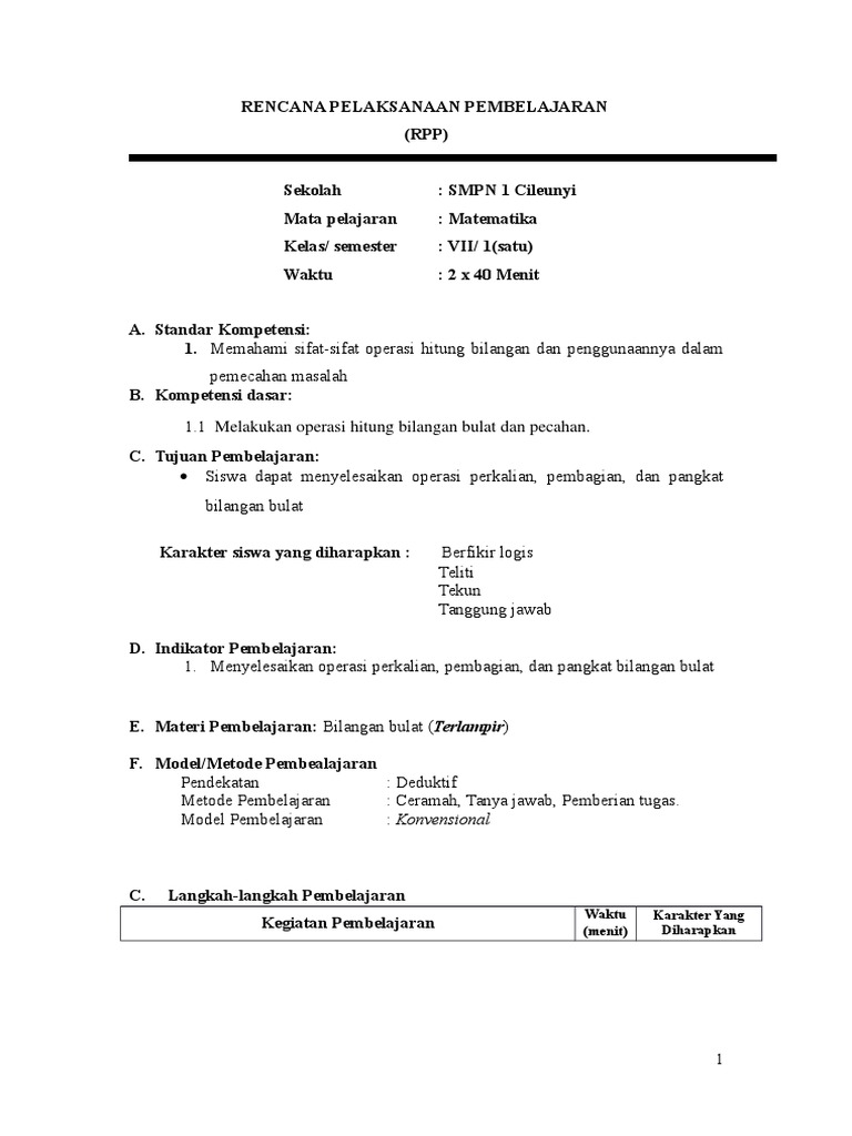 Rpp Matematika Kelas 7 Mts Perkalian Dan Pembagian Bilangan Bulat